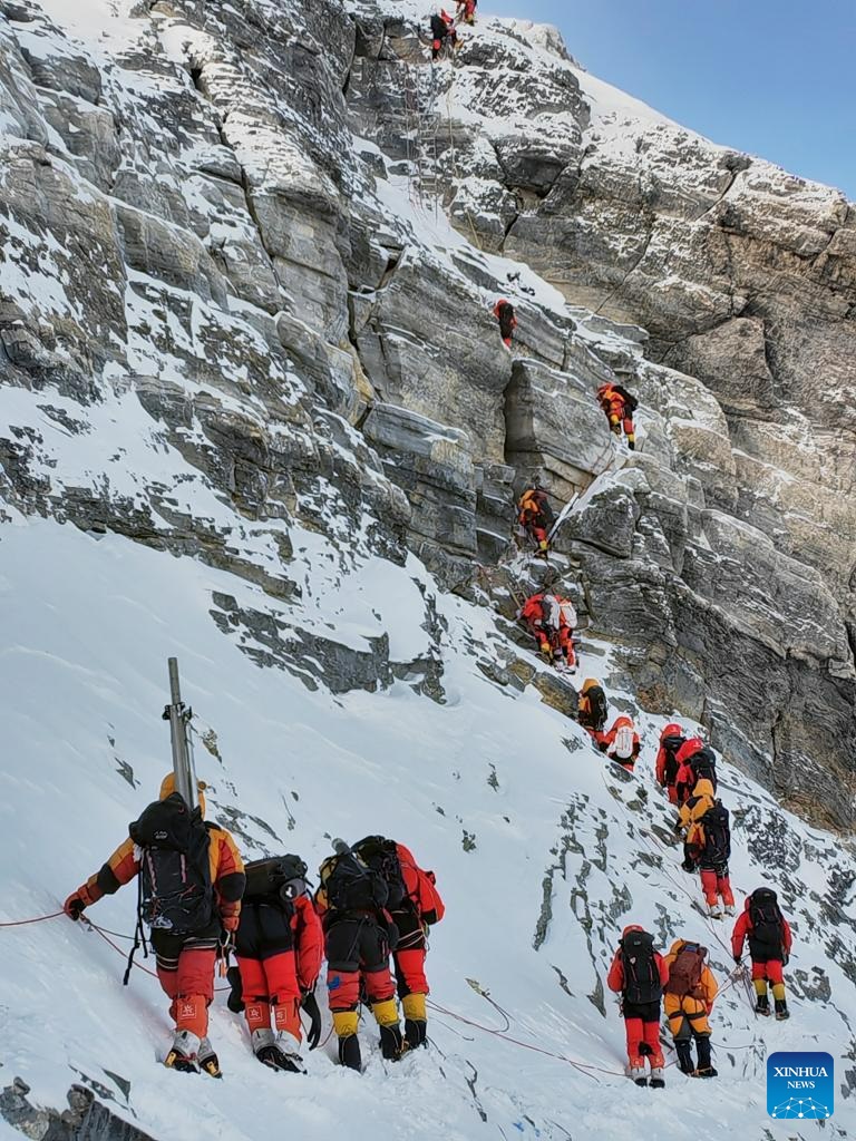 معسكر قاعدة جبل تشومولانغما، التبت، 23 مايو 2023 (شينخوا) وصل فريق بعثة صينية إلى قمة جبل تشومولانغما اليوم الثلاثاء، في إطار تطلعهم لإجراء بحوث علمية على أعلى قمة في العالم.